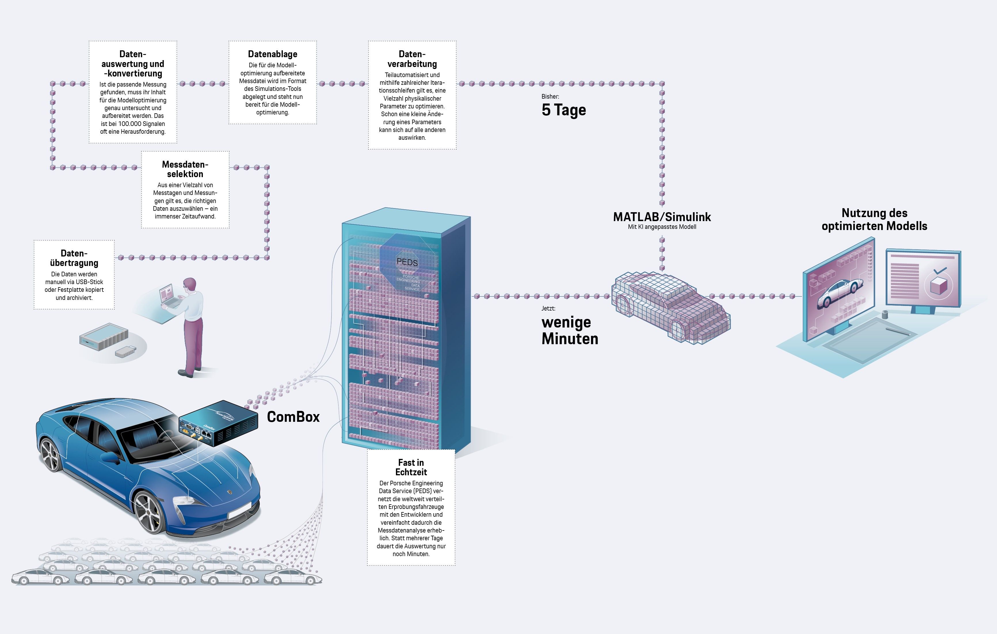 Der Porsche Engineering Data Service (PEDS) vernetzt die weltweit verteilten Erprobungsfahrzeuge mit den Entwicklern. Mit der speziell dafür entwickelten ComBox lassen sich Daten fast in Echtzeit an die PEDS-Server senden, wo sie aufbereitet und automatisch ausgewertet werden. Das verringert den Aufwand und verkürzt die Entwicklungszeiten erheblich.