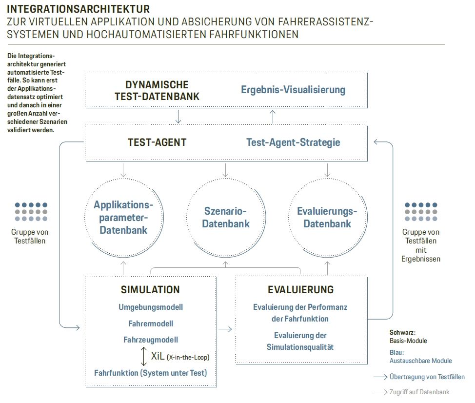 In einem Entwicklungsprojekt untersucht er darum den Aufbau einer modularen, virtuellen Integrationsarchitektur für Fahrerassistenzsysteme und hochautomatisierte Fahrfunktionen. Ihr Grundgerüst besteht aus Basisbausteinen – beispielsweise für die Testfallerstellung, -simulation und -auswertung –, die unabhängig von der zu prüfenden Fahrfunktion eingesetzt werden. Je nach Entwicklungsprojekt wird dieses Grundgerüst durch austauschbare Module erweitert, um die Architektur an das zu testende System anzupassen. Das verleiht der neuen Methodik hohe Flexibilität, um einerseits die Breite der Entwicklungen und andererseits die Anforderungen der Zukunft abdecken zu können – obwohl diese im Detail heute noch gar nicht feststehen.