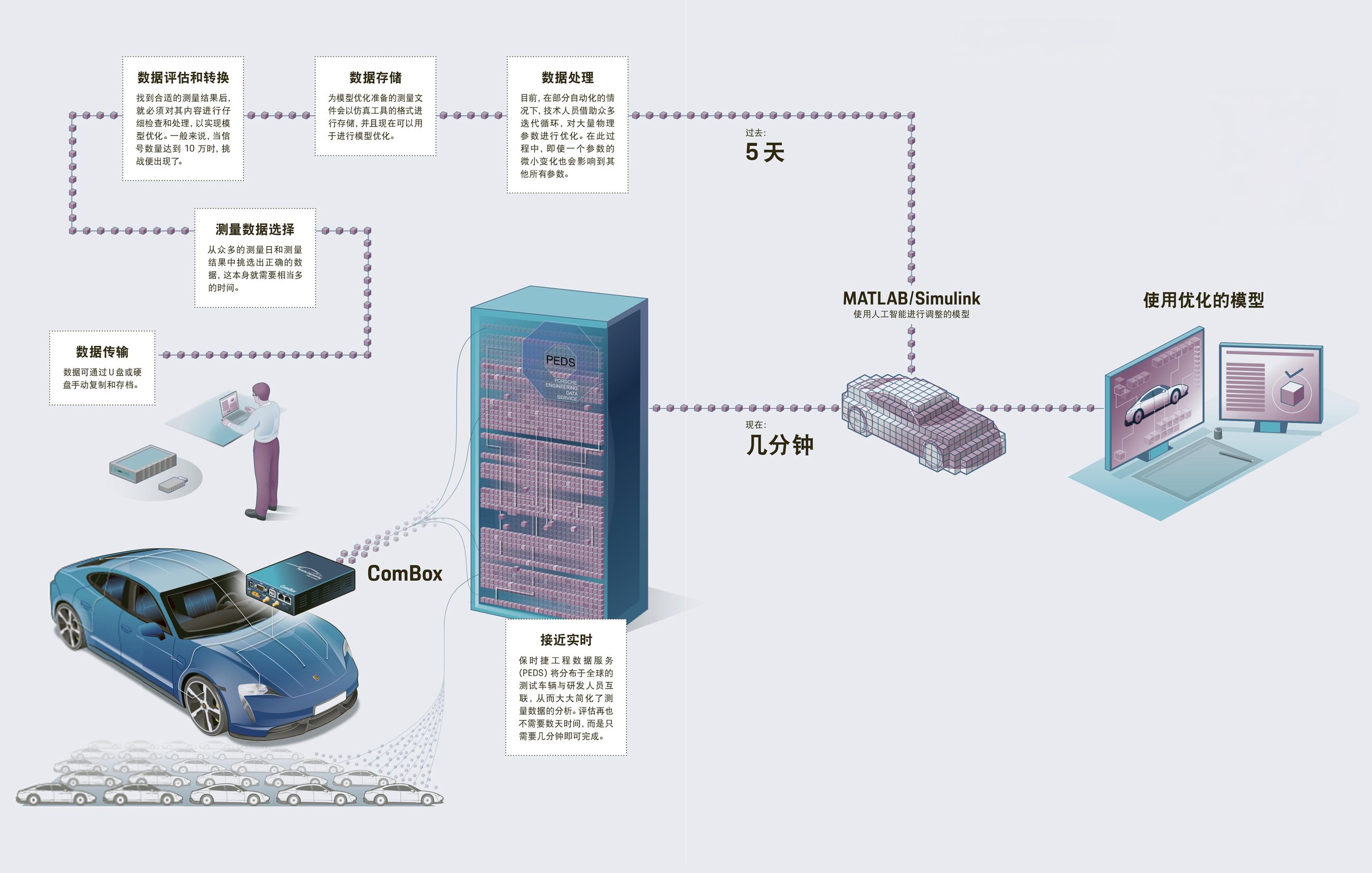 在 PEDS 的帮助下,“数字孪生”(即部件仿真)的创建和对比也变得更加容易了。例如,保时捷工程公司的研发人员已通过电动汽车的高压蓄电池创建了这样一个模型。它的热力表现与真正的蓄电装置完全一样。这个拥有 37 个参数的模型采用 PEDS进行了优化:在测试车辆行驶过程中,来自测试车辆的数据就已经开始流入数学仿真模型中,由此不断改进这个模型。这样做的好处是:可以将误差值,也就是蓄电池的真实特性与仿真特性之间的偏差直接减半。佩纳特说:“现在,我们可以真正‘实时’进行这样的操作,这是一个真正的突破。”